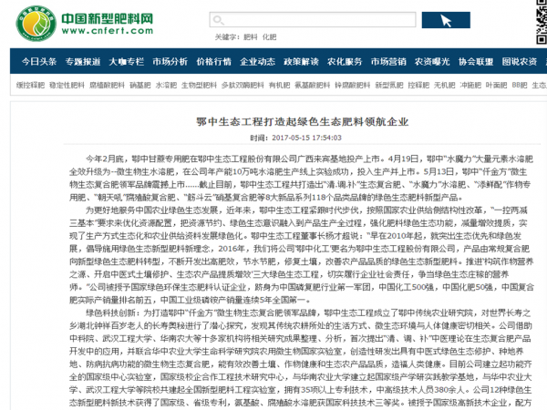 《農(nóng)資與市場(chǎng)》.《中國(guó)新型肥料網(wǎng)》.《鐘祥市政府網(wǎng)站》.《北方農(nóng)資》:鄂中生態(tài)工程打造綠色生態(tài)肥料領(lǐng)航企業(yè)