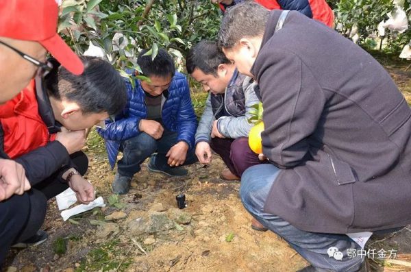 現場一:室內技術交流講座。鄂中技術推廣中心農化專員、代理商農技推廣員、12年種植經驗的示范戶三方協同交流講座,推進施肥種植技術服務,聚焦區(qū)域橘園(耙耙柑)。發(fā)放技術資料300余份,現場講解答疑施肥種植技術100余次,以技術服務贏取市場。相同技術管理水平,樹勢良好的不如示范園,使用鄂中仟金方技術共管與農戶自管形成對比。