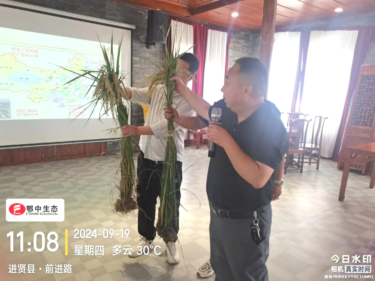 種植戶俞有才激動地分享著自己的“第一次”嘗試——今年,他首次使用了2噸鄂中仟金方42%(22-8-12)微生物生態(tài)復(fù)合肥,這一決定源自別人的“說者無心”,他的“聽者有意”。俞有才巧妙地設(shè)置了“田間實驗室”,在道路兩側(cè)的水稻田里,一邊施用鄂中仟金方,另一邊則是傳統(tǒng)肥料?,F(xiàn)場,兩株水稻的直觀對比,是最直接的證言:鄂中仟金方孕育出來的水稻,葉片如扇,翠綠欲滴,分蘗茂盛,幾乎是對照田的兩倍;抽穗飽滿,數(shù)量更是多出1/3,在場的農(nóng)戶紛紛贊嘆不已。