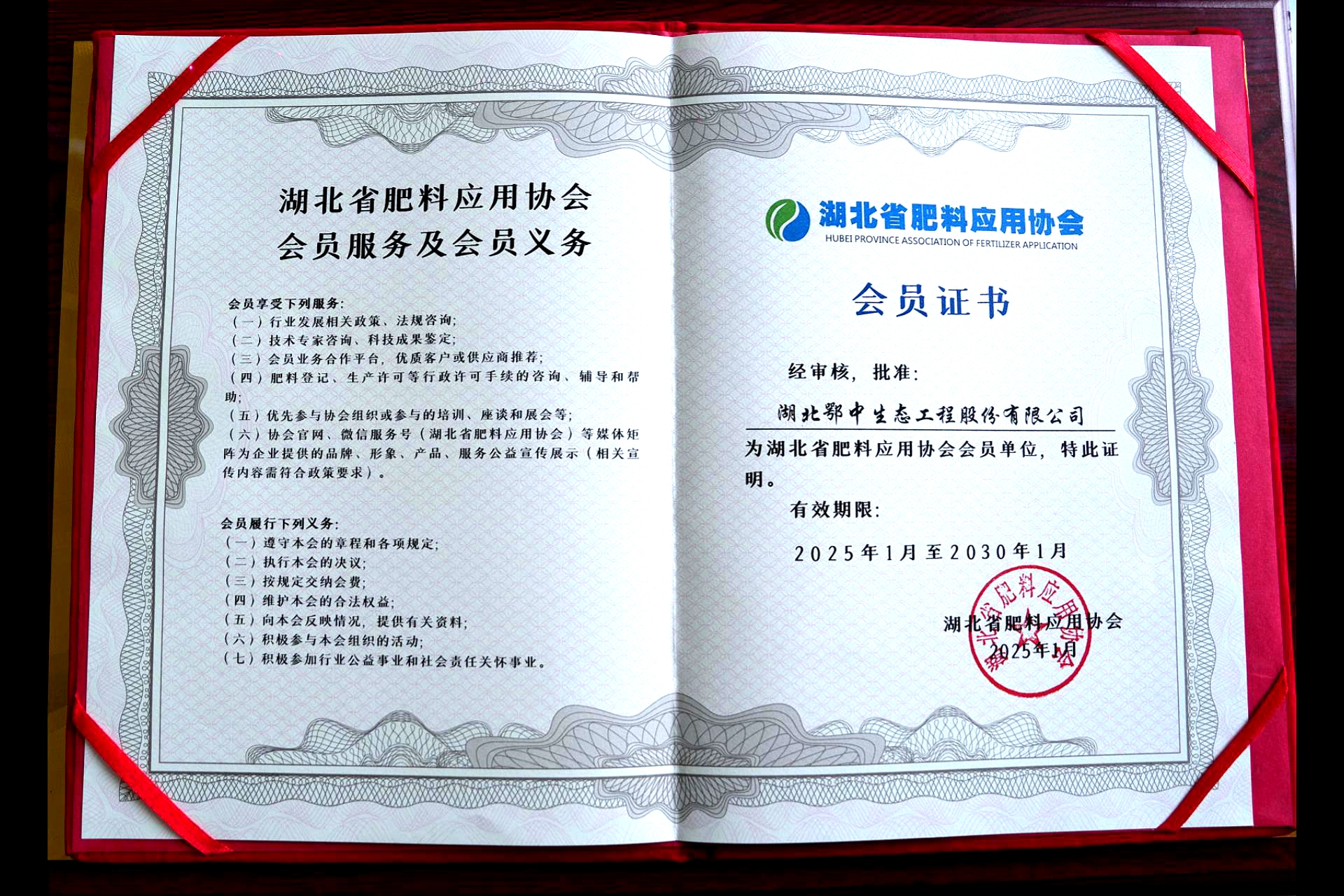 鄂中生態(tài)成為湖北省肥料應(yīng)用協(xié)會及農(nóng)藥協(xié)會理事單位