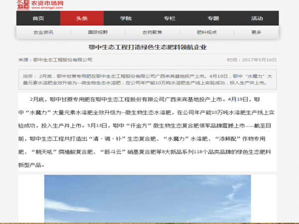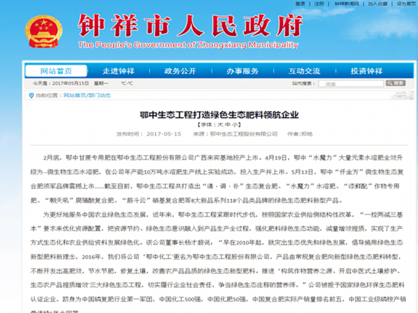 《農(nóng)資與市場》.《中國新型肥料網(wǎng)》.《鐘祥市政府網(wǎng)站》.《北方農(nóng)資》:鄂中生態(tài)工程打造綠色生態(tài)肥料領(lǐng)航企業(yè)