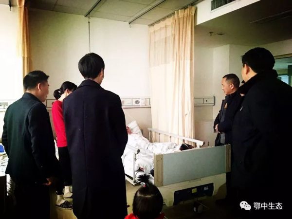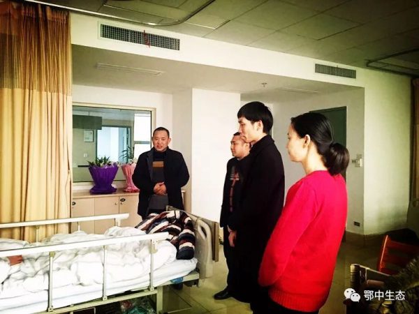 ?????? 2018年1月1日下午鄂中生態(tài)工程股份有限公司工會(huì)副主席吳全策,人力資源部副部長邱克明以及豐神農(nóng)資辦公室主任夏洪元、梁鑄一行帶著楊董事長的關(guān)心和公司各部門兄弟姐妹的牽掛前往荊門二醫(yī)血液科看望了患病員工羅榮寶。吳主席一行向羅榮寶同志表達(dá)了真誠的問候,讓他積極配合治療并鼓勵(lì)他戰(zhàn)勝病魔,早日恢復(fù)健康,回到我們的大家庭中來,并送上了鮮花果籃等慰問品和愛心捐款103882元及2000元工會(huì)慰問金。