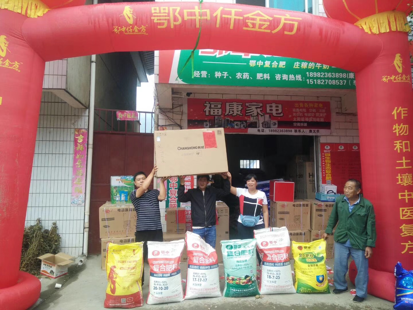 此時,羅天元一家早已等候多時,他和老婆、兒子迅速打開店門。我們立刻行動起來,熟練地架起帳篷、支起拱門、掛上橫幅,還將各類樣品肥料整齊地擺放在門前。緊接著,宣傳廣告的喇叭聲響起,為這場促銷活動拉開序幕。